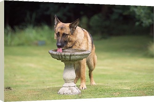 40 Canvas Print, White Sides. , German Shepherd / Alsatian Dog - drinking from bird bath. JD-15371 German Shepherd / Alsatian Dog - drinking from bird bath John Daniels Please note that prints are for personal display purposes only and may not be reproduced in any way. contact details tel and 44 (0) 20 8672 2067. Chosen by Ardea. Ready to hang, 101cm along the longest edge (other side scaled to fit). High quality 300gsm canvas with Fujifilm