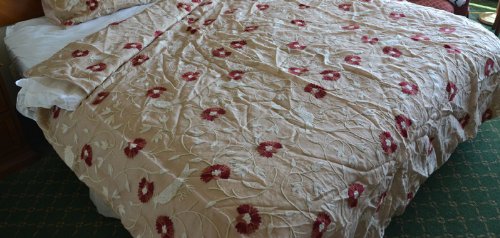 Inspiration: From the cathedrals of Rome to the temples of India Art Nouveau has been the cornerstone of the awe inspiring monuments cherished by the world for centuries. The use of skill and imagination in the creation of aesthetic objects, environments, or experiences that can be shared with others has intrigued human thoughts for centuries. This pattern is our attempt to capture the mystique of Art Nouveau. Features: ? Hand-stitched, 100% wool on Silk Organza ? Pattern on Silk Quilt and sham; euro sham features the same pattern ? Imported ? Backed and piped in matching Silk Organza ? Button closures ? Dry-clean recommended Features: Fabric Type: Silk Organza Fabric Detail: Silk with Wool Jacobean Embroidery Pattern: Snow Bird Color: Raw Vertical Repeat: 68" Horizontal Repeat: 86" Hand-stitched, 100% wool on Silk Quilt Pattern on Silk Quilt and sham; euro sham features the same pattern Imported Backed and piped in matching Silk Quilt Hidden zipper closure Dry-clean recommended Size: 106X92 inches