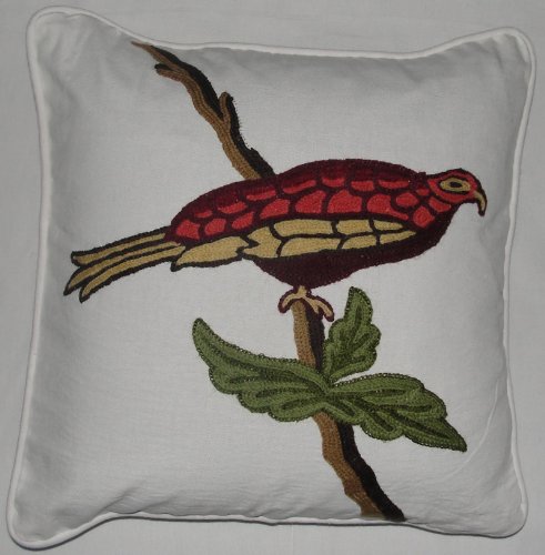 Like the Potterybarn Spring Sparrow Pillows our Red-winged birds are hand embroidered over a printed pattern of leaves to create pillow covers with striking dimension and graphic punch. 18" square * Hand embroidered with 100% wool on cotton base ? Backed in solid-color canvas * Insert is sold separately; Down Blend or Synthetic ? Hidden zipper ? Dry-clean Recommended. Machine Washable ? Imported Handmade in Kashmir Fabric Type: Cotton Duck Fabric Detail: Cotton with Wool Jacobean Embroidery Pattern: Red Bird Pattern Detail: Red Bird Color: White Color Detail: White Length: N/A Width: 18 " Height Repeat: 18" Artisans in a remote mountain village in Kashmir crewel stitch these blossoms, vines and leaves by hand, resulting in a lush pattern of richly shaded wool yarns on Linen, Cotton, Velvet, Silk Organza, Jute also backed in natural linen, Cotton, Velvet Silk Organza, Jute with a hidden zipper. Size: 18X18 inches