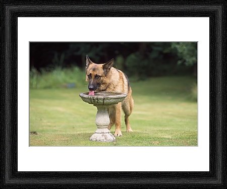 Framed 10x8 Print, Black Grain Bevel with White Mount. , German Shepherd / Alsatian Dog - drinking from bird bath. JD-15371 German Shepherd / Alsatian Dog - drinking from bird bath John Daniels Please note that prints are for personal display purposes only and may not be reproduced in any way. contact details tel and 44 (0) 20 8672 2067. Chosen by Ardea. 10x8 (25x20cm) print in 12x10 frame with high quality custom mount. Wood Grain effect
