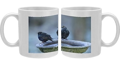 Photo Mug, Starlings Sturnus vulgaris at frozen bird bath in garden Kent winter. Starlings Sturnus vulgaris at frozen bird bath in garden Kent winter. Chosen by David Tipling. Polyester coated dishwasher safe ceramic mug. Weight 11oz, diameter 80mm, height 95mm. Image printed twice where practical and attached using dye sublimation process for seamless appearance and vivid colours. Sent in polystyrene box with card outer.