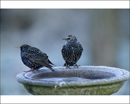 Photographic Prints of Starlings Sturnus vulgaris at frozen bird bath in garden Kent winter from David Tipling Available at Amazon.co.uk